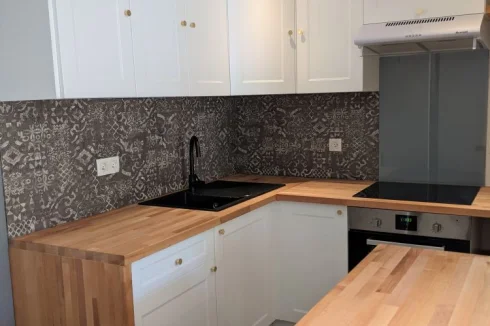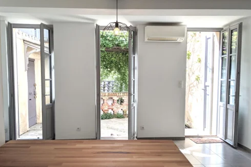 Ground Floor: A cute living space with 3 french windows opening on to the terrace and an open plan kitchen (fully equipped and brand new)