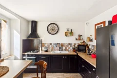 Three-bedroom house to renovate, with a fitted kitchen, bathroom, and large living room with a wood-burning stove on the ground floor.