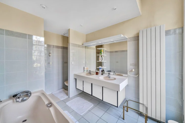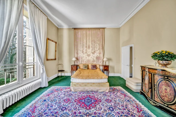 Land area: 58'032m2 (15 acres) completely enclosed by a wire fence, mostly forest with trails, planted with oak approximately 150 years ago. Large sloped lawn with mature trees leading down towards and permitting views of the countryside. At the bottom of the garden there is an area which sometimes fills with water, and could be converted into a swimming pond approximately 27m by 10. Another area next to the property could be converted for use as a tennis court.