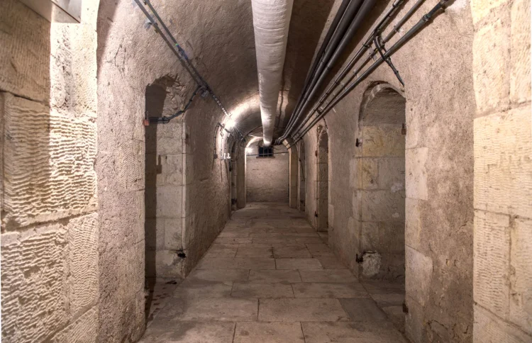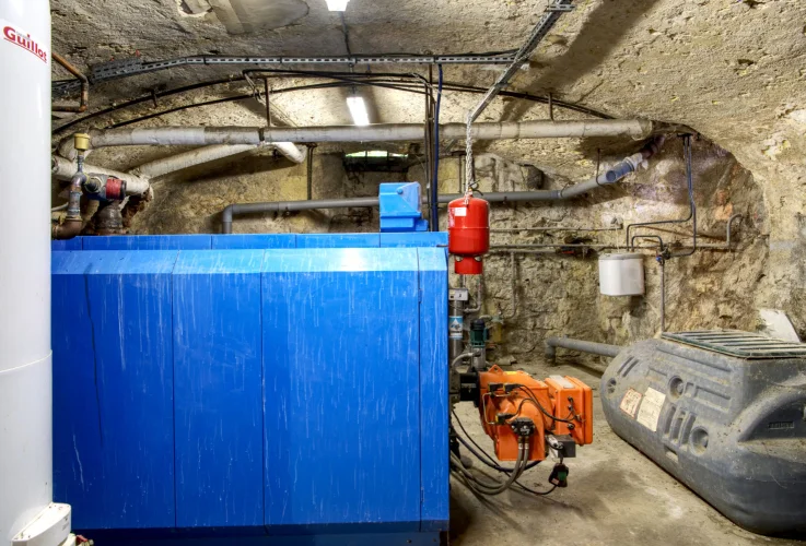 Basement: Eight vaulted cellars one used for the Buderus boiler (2005) and grey water management, one containing a walk-in cold-room dating back to the time when the Château was used as a restaurant, one for heating oil (6000 litres,) the remainder mostly free. Three modern biological septic tanks, grey water collection tank. The Château has it's own electricity transformer (provided by EDF) rated at 100kVA delivering a three phase supply.