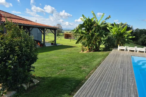 A magnificent entrance with electrified gate, a driveway and a tarmac parking lot. A new fenced garden with its beautiful lawn surrounds the wooden deck of the 8x4m swimming pool. Petanque ground, vegetable garden and large chicken coop. On the side of the house you will find a 160m² barn with 3 boxes, a large horsedressing room and hay and straw storage overlooking an old quarry with horses shelter.