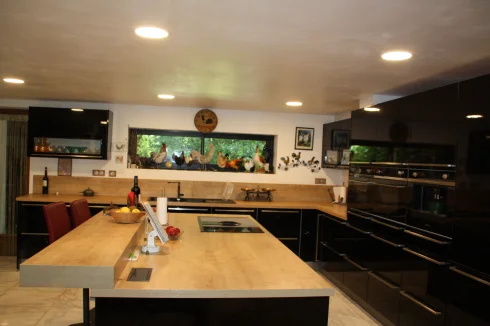Large utility room, with a galley type kitchen, includes gas hob and electric oven. Large comfortable salon with Godin wood burner. Library.
