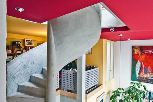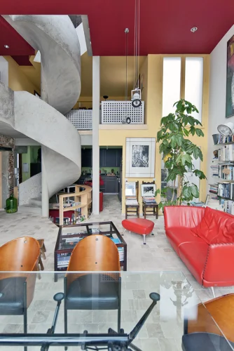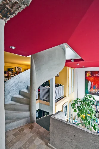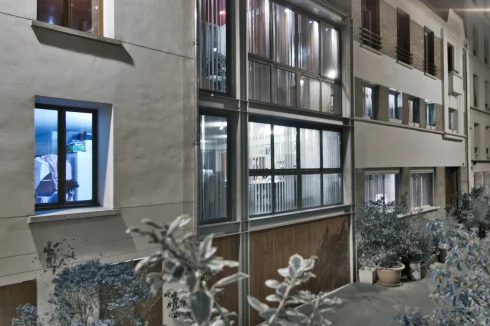 The building is part of a 19th-century structure with historic character, but with modern interventions to integrate outdoor spaces (terraces) into the volume.