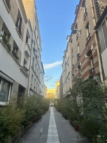 The property is located in a tranquil, car-free passage (Passage Alexandrine), part of a quiet, pedestrian-oriented lane within the 11th arrondissement.
