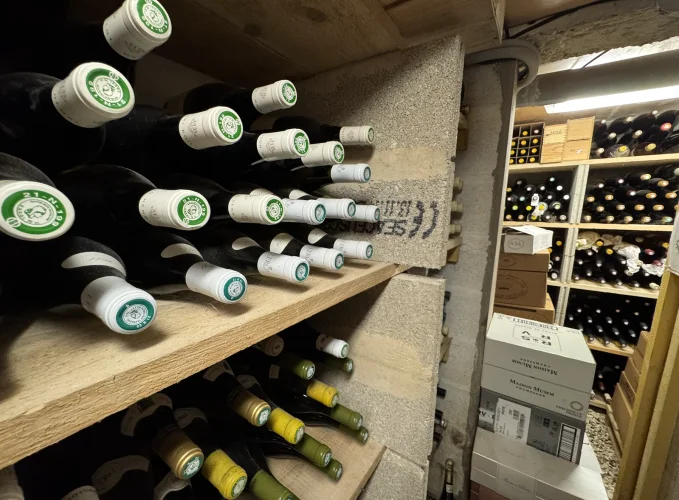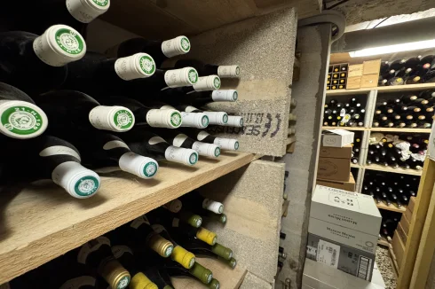A 22 m² climate-controlled wine cellar, cedar racking for ~1,200 bottles, at a constant temperature and humidity.