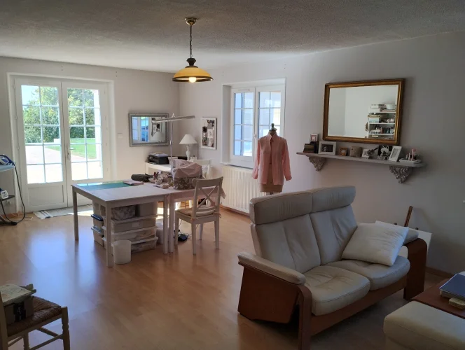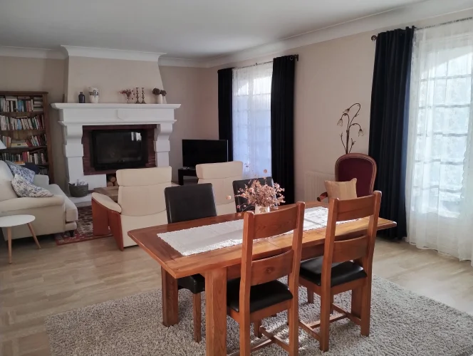 A traditionally built residence that offers approximately 261 m² of expansive living space. The interior comprises a capacious entrance hall, a formal living room featuring an insert fireplace, a well-appointed kitchen with an adjoining store room, and three generously proportioned bedrooms, each equipped with fitted wardrobes. The main bathroom, spanning 11 m², includes both a shower and a bathtub, and a double vanity unit, and a separate WC.