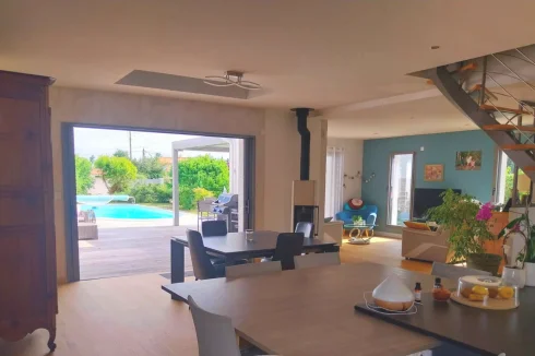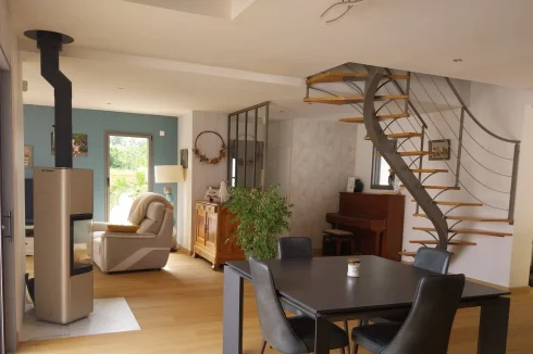 This house features an entrance hall with built-in closet and separate toilet, opening onto a spacious living area of around 70 m² with a wood-burning stove and a fully fitted and equipped kitchen.