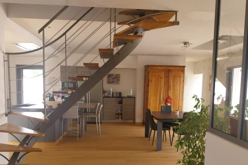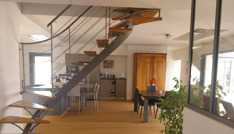Upstairs, a unique metal-and-wood staircase leads to a 20 m² multipurpose room, ideal as a home office, playroom, or guest bedroom for family and friends.
