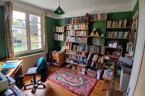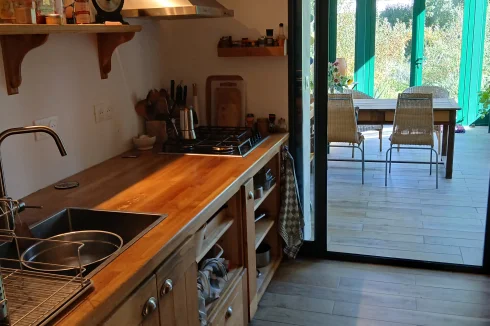 Removing some walls and doors, whilst preserving the wooden parquet flooring and 1950s tiles, I created more light and space. Local cabinet makers replaced some doors and a new kitchen . The lovely new conservatory transformed the house. reconnecting to the garden which surrounds the house leading into the medicinal herb garden, willow circle ,the fruit garden, vegetable area and wildflower meadow.