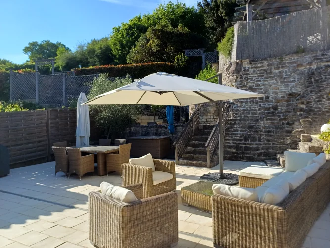 Beautiful main terrace accessed directly from the main house & house 2, with steps up to the pool terrace with adjoining garden areas.