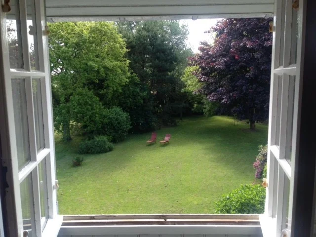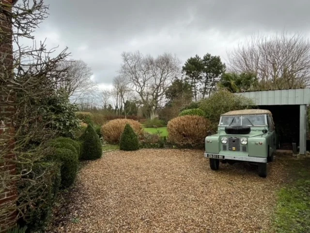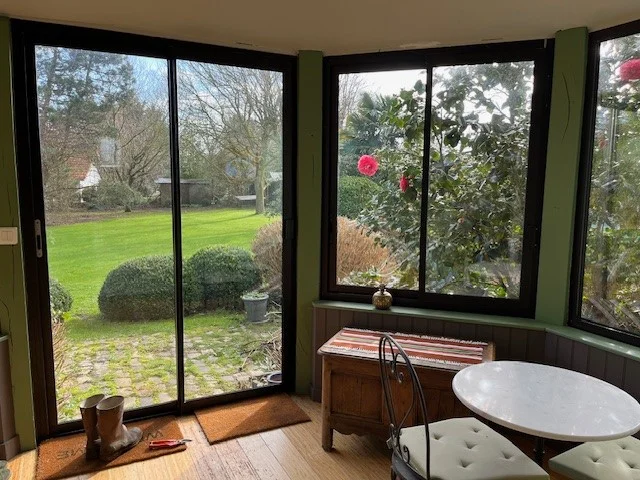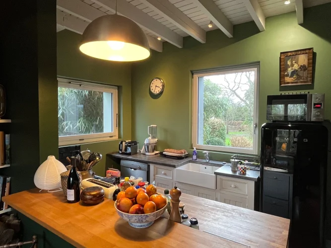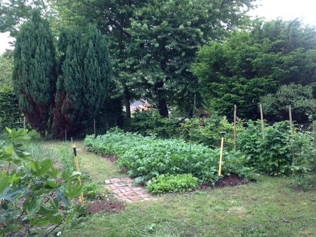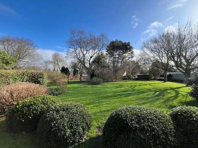 - Large enclosed 1,300 m² garden, flat and landscaped, with outbuilding + parking for several cars. Fuit trees, flowers and vegetable patch
