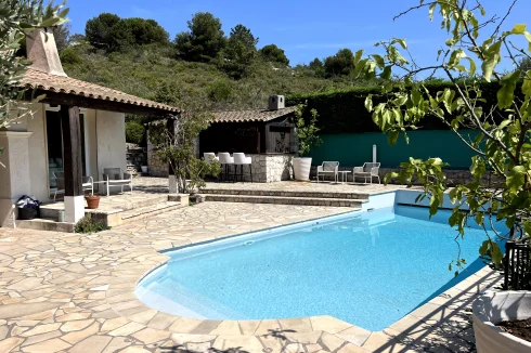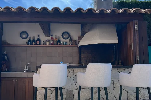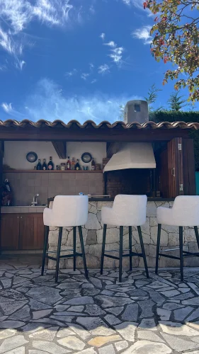 Exceptional Outdoor Amenities: The exterior includes a stone-paved terrace, a private swimming pool, and a fully equipped outdoor summer bar with professional seating.