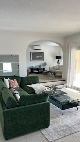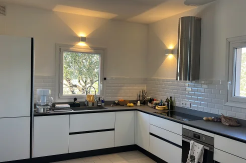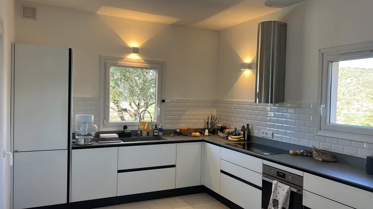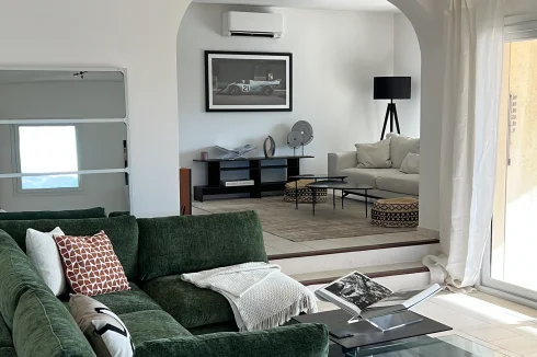 The interior of the villa is a masterclass in modern Mediterranean elegance, characterized by a seamless flow of light and sophisticated architectural details. The heart of the home features a spacious double reception room with soaring arched transitions, creating an atmosphere of refined comfort. A contemporary designer kitchen serves as a functional centerpiece, boasting minimalist white cabinetry, premium integrated appliances, and stylish subway-tile accents. Throughout the residence, a clean-lined aesthetic is complemented by high-end finishes and large sliding glass doors that frame the stunning coastal views, ensuring that the vibrant Mediterranean landscape is felt in every room.
