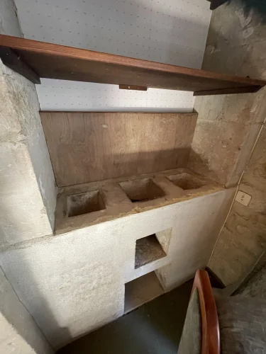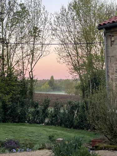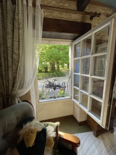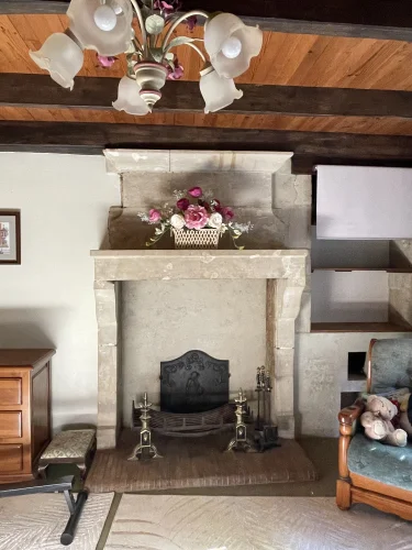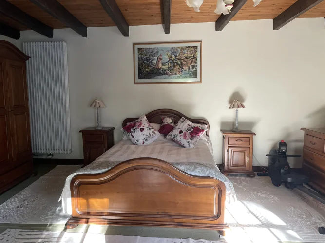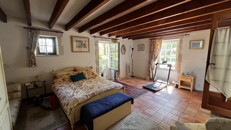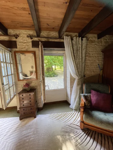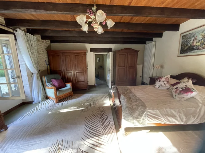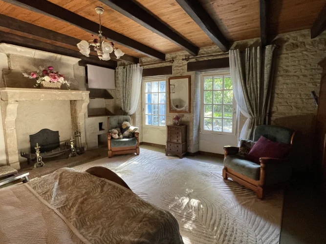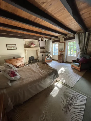 The salon also leads upstairs to 2 further large bedrooms and a large family bathroom via a landing. The landing has 2 oak linen cupboards. The landing also has the front door leading to the garden. One bedroom is again dual aspect ( south and east) with a chestnut floor. The stone chimney passes through this room. It also has a wall mounted air conditioning unit. Huge wardrobe, baroque bed and side tables are included. The other bedroom faces east and sun streams through the 2 windows in the morning. This room has another old, non working fireplace and a “ potager”. In years gone by, people could cook on this ancient Vendeen kitchen. Again , the wardrobes, bed and side tables are included.