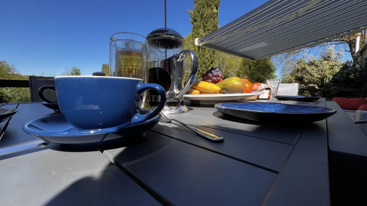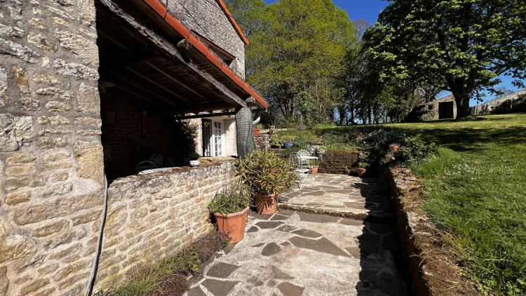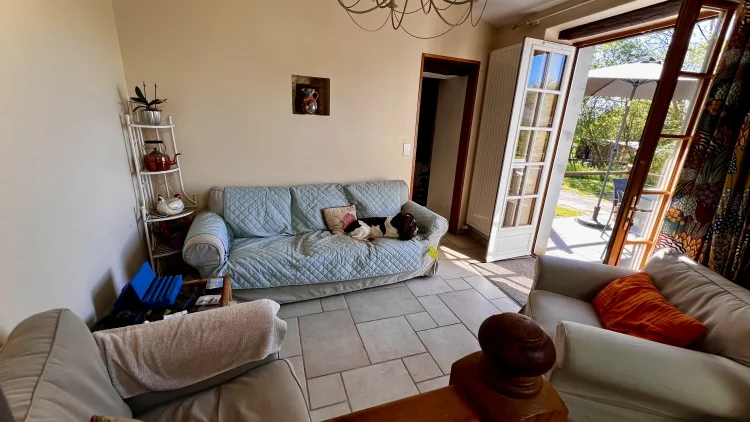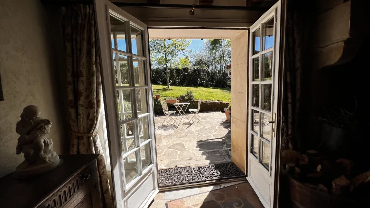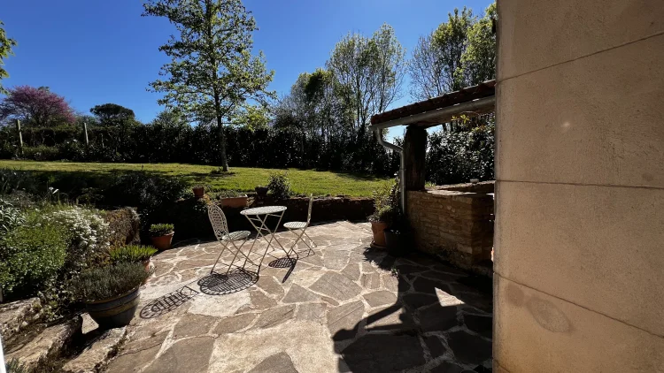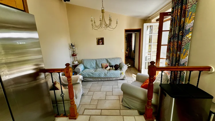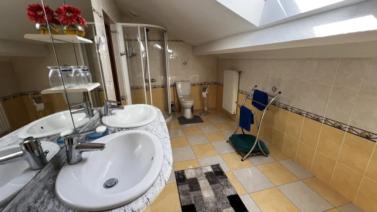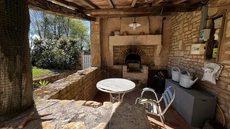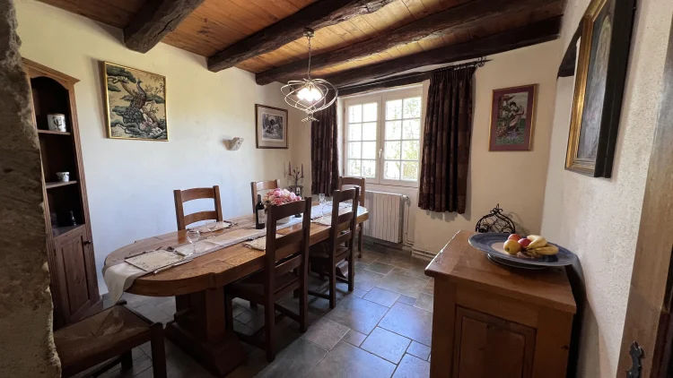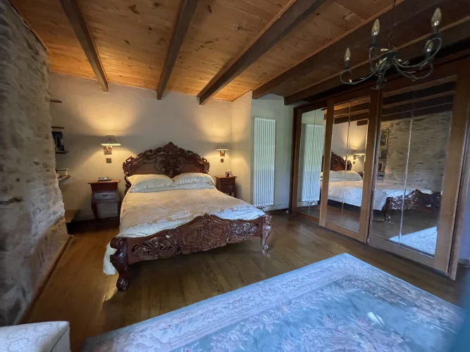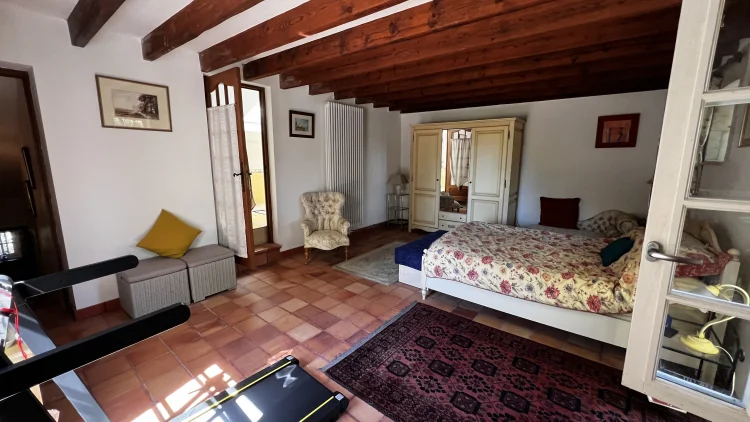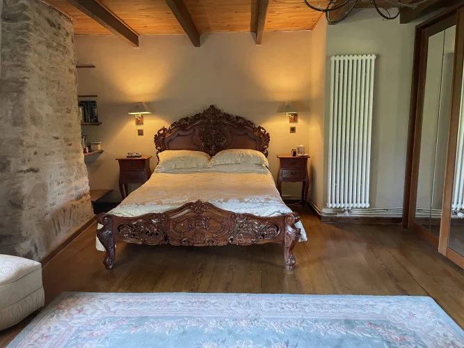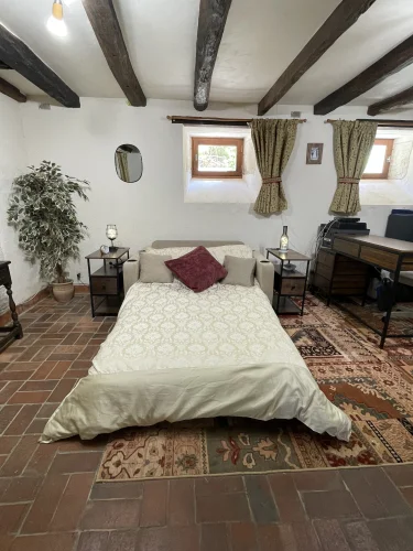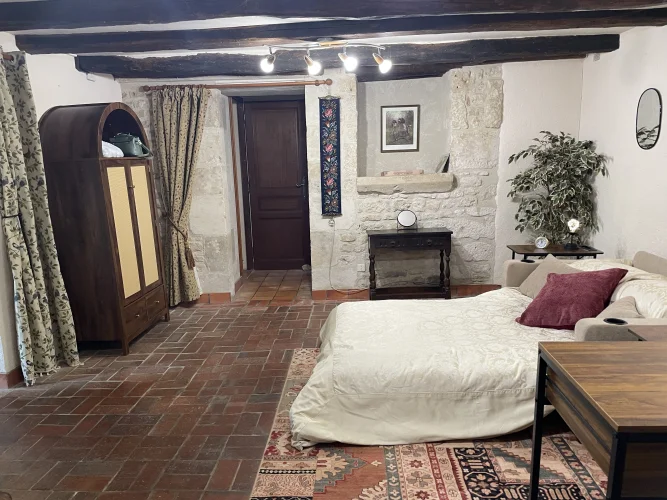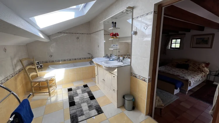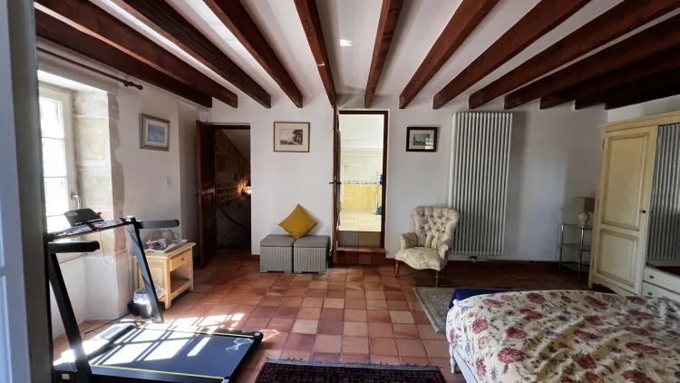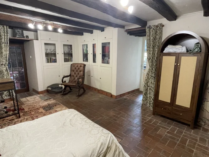 You then walk through to the salon/lounge. An L shape room, this lends its self to various layouts. With an ancient stone fireplace, wood burning stove and 2 old wall alcoves, this room is full of character. From here, you can access the stone patio through double glazed doors. Here you will find a covered area with an old working bread oven. It’s really quite something. The salon also leads to bedroom 4/office. This brick paved room is cosy and inviting. It contains an old stone sink and storage shelves and could easily be incorporated with the guest suite into a rental area. Leading through to a toilet then up solid steps to the guest suite. Another light filled, dual aspect room, with large en suite bathroom. With minor works, this could easily be turned into a chambre d’hôte or Airbnb. All furniture is included.