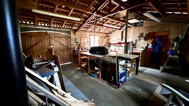 Next to the house is a separate building, currently used as a woodworking shop and a garage for the ride on mower ( not included) and other maintenance tools. The woodworking shop side includes a table saw, thicknesser/planer, pillar drill, bandsaw, chop saw, router and many other smaller tools. It also has an extraction system. The other side is racked out for storage too.