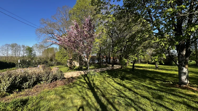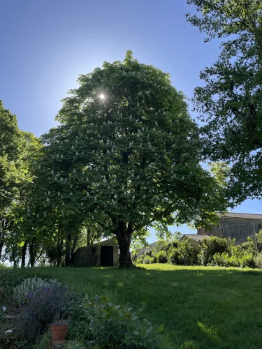 ornamental trees and a small stone outbuilding. One feature is a large horse chestnut tree. Another is an old agricultural machine inherited with the house when we bought it.