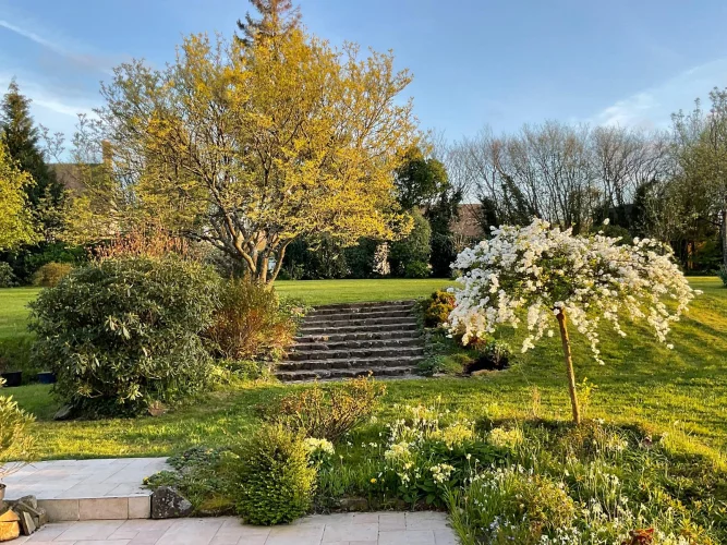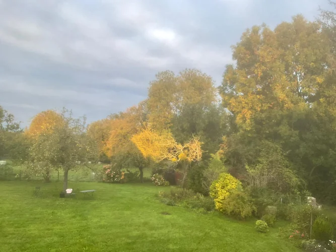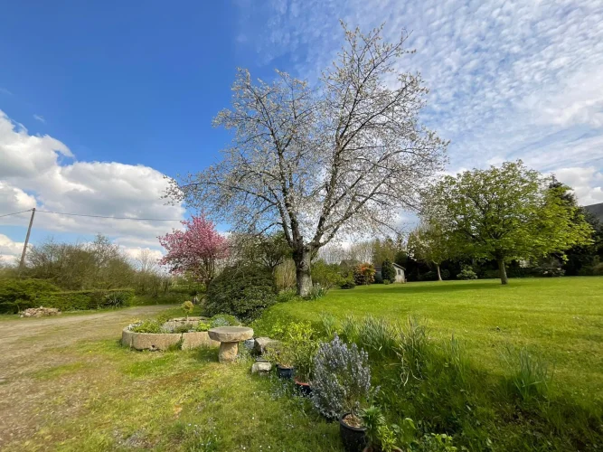 The garden comprises a large expanse of lawn, planted with mature trees, including apple trees and a large cherry tree. There is a lean-to storage area on the side of the house and a large shed. The garden has a water well, which is obviously useful for watering the garden.