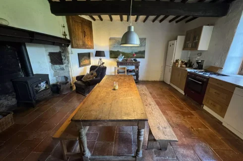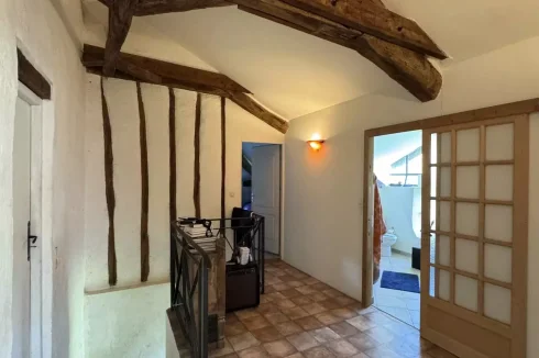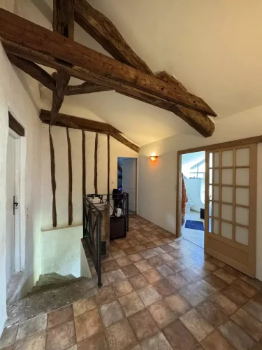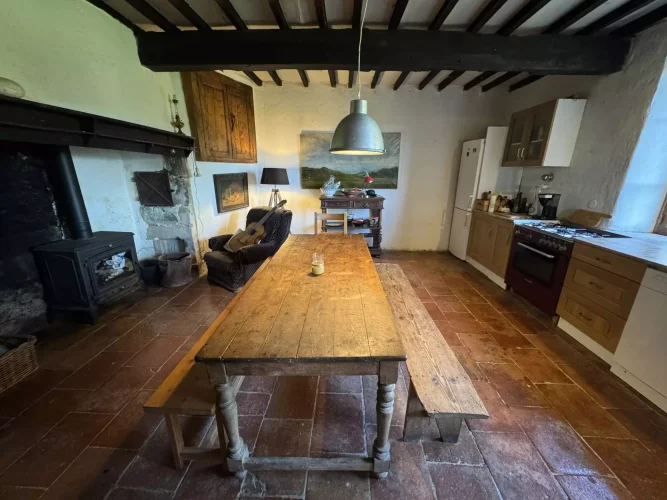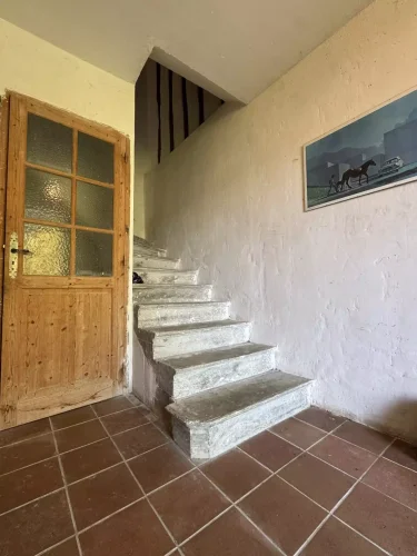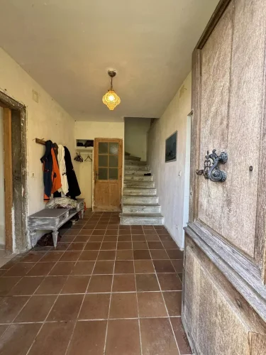 On the ground floor is the entrance hall opening onto a hallway with a toilet, leading to two 30 m² rooms, a living room, and a kitchen with terracotta floor tiles, a wood-burning stove, and a bread oven.
