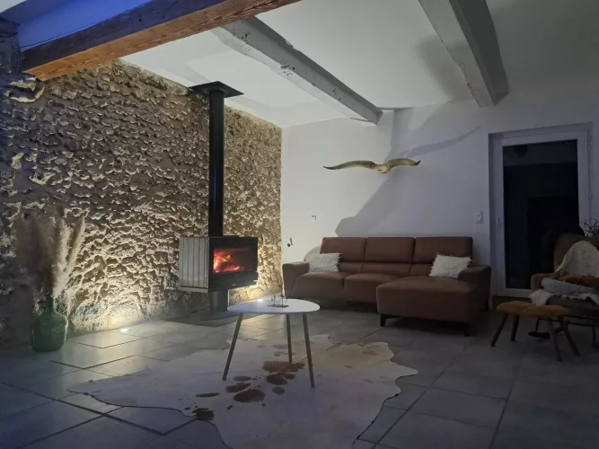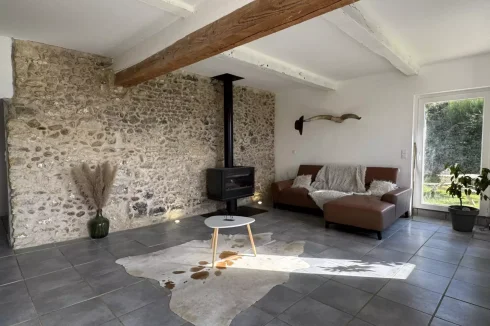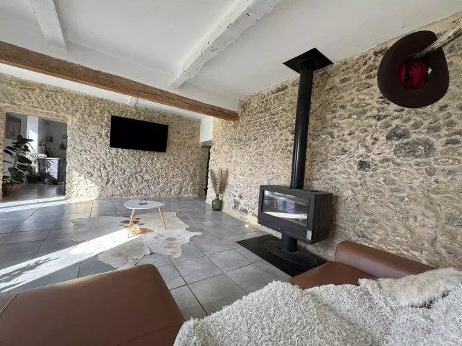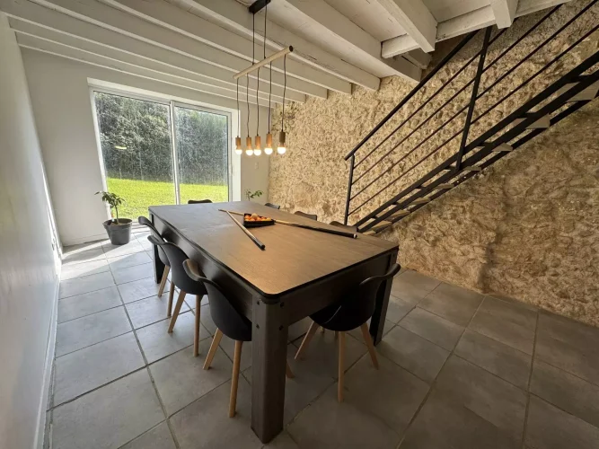 On the ground floor, an entrance hall leading to a large, semi-open living room/kitchen of almost 55 m² with a wood-burning stove and cooker, very bright and full of character, a pantry/laundry room and a 20 m² dining room, then a shower room with toilet.