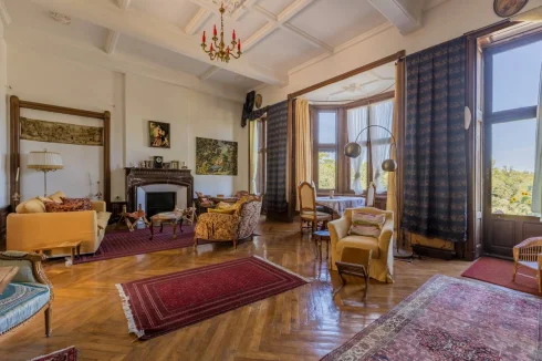 Living room (46m²) with marble fireplace and original oak parquet flooring, door opening onto the large terrace