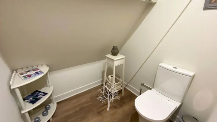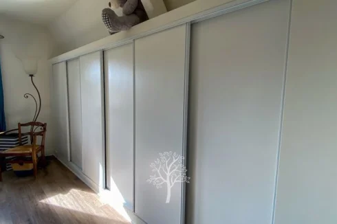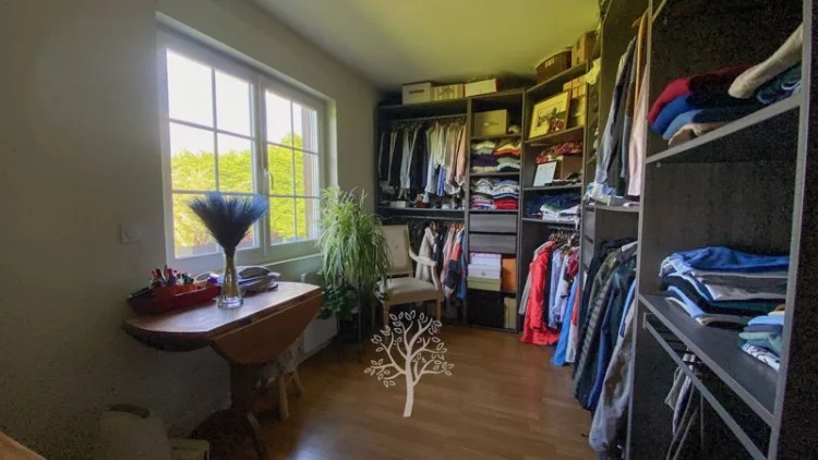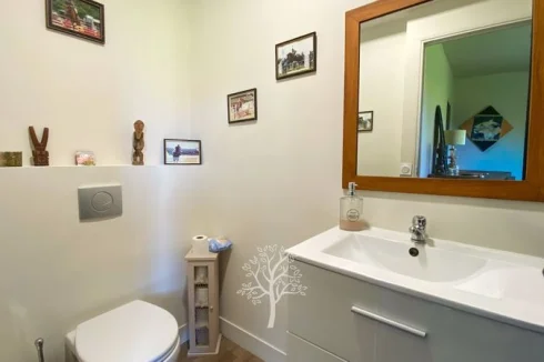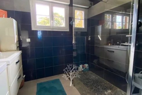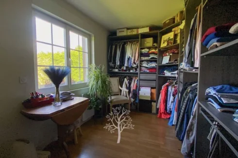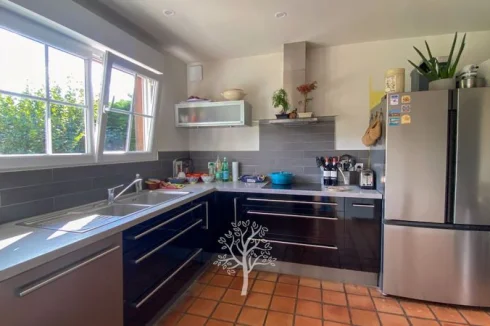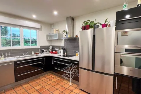 There’s a total of 150m2 of habitable space. On the ground floor is a fully fitted contemporary kitchen, utility room, large living room with double-height ceiling and open fireplace (Polyflam system), dining room and master bedroom with en suite bathroom.