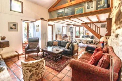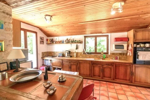 Off the main living room, and again open-plan is a large kitchen and pantry with access to a paved terrace overlooking the garden and the pool.