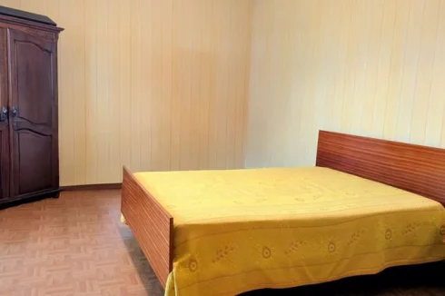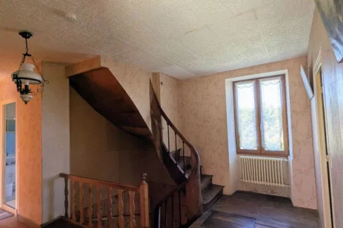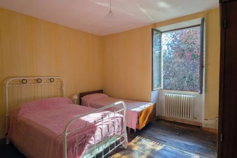 A lovely wooden staircase leads up to four generous bedrooms and a bathroom. Some rooms still have their original parquet flooring hidden beneath newer floors, while others already show off the beautiful old wood — a nice nod to the home’s history.