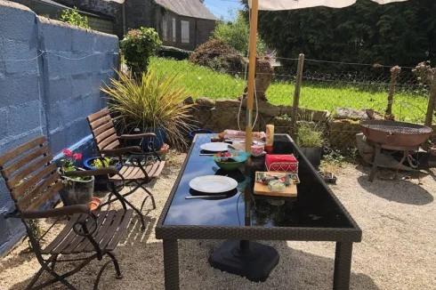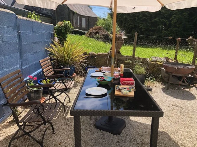 Immediately outside the house is a courtyard and parking spaces. Across the road is a field, approximately 1/3 of an acre, which has a log store and barn. The garden furniture and ride-on lawnmower is included in the sale.