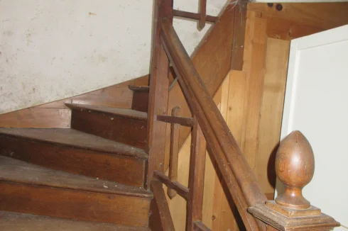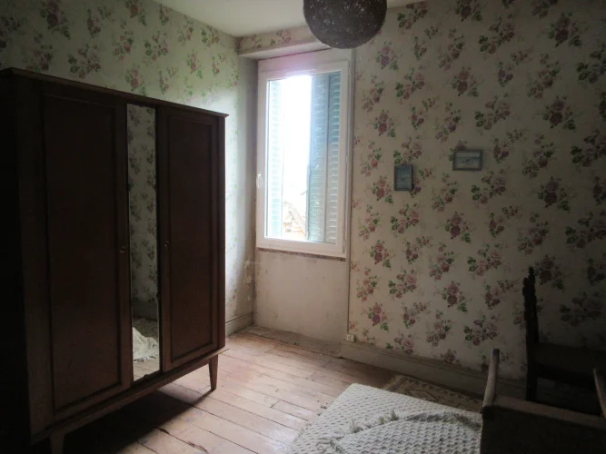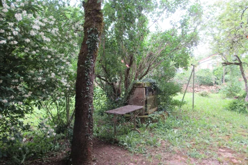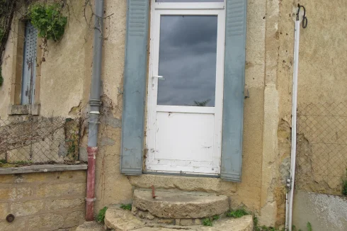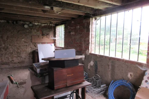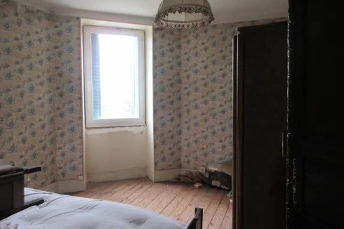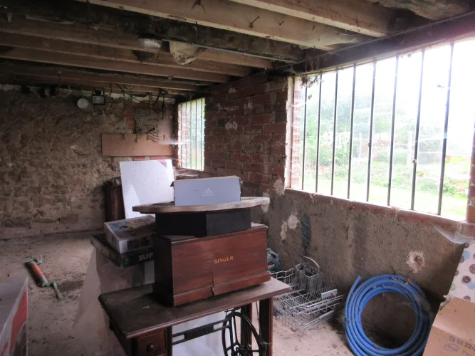 The house comprises on the ground floor a kitchen and sitting room and upstairs 2 bedrooms and the future bathroom. There is an attic above, a vaulted cellar below, a wee outbuilding and a garage with an attic space. The house sits in the approx. 600 m² walled garden.