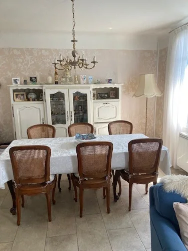 Looking for your dream home? This charming house offers the perfect blend of comfort and convenience, ready to welcome you. With its spacious living areas and abundant natural light, it's ideal for relaxing and entertaining guests. The property features several bedrooms, modern bathrooms, and a lovely garden ideal for outdoor entertaining or relaxing afternoons. Located in a friendly neighborhood with easy access to schools, shops, public transportation, and the lake, it's perfect for families or anyone looking to lead a peaceful life while staying connected. Main house with entrance to corridor with 2 cupboards serving a fitted kitchen of 14.45m², a living/dining room of 25.56m² with wood insert, 3 bedrooms including one with en suite WC and sink (9.56 - 11.95 and 12.61m²), a new shower room of 6.13m² with WC and underfloor heating and a converted room located in the attic of 17.15m². Separate gite with possibility of renting: Living/dining room 9.84m², a fitted kitchen of 6.22m², a modern shower room of 3.56m², 2 bedrooms (8.79 and 9.80 m²), terrace. Recent renovation, car parking, 2 garages, garden with terrace, latest generation electric radiators, wood insert with ventilation outlet, optical fiber, south facing, partial double glazing, recent attic insulation, Property Tax: €1784/year
