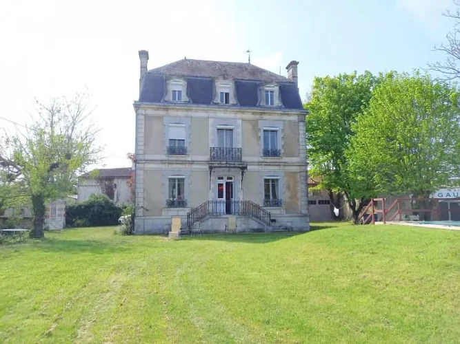 Detached stone and slate "Maison Bourgeoise" property, situated in a village not far from the shops, in the area of Aigre, with a wooded enclosed garden area of 1 577 sqm with a swimming pool and a terrace. Heating : gas central and wood. Garage(38 sqm). Workshop. Boiler room. Internet connection available. Annexe. The house is 300 meters from the shops, 900 meters from a supermarket and 100 kms from the Atlantic coast. Tax fonciere : 2 493 euros/year. DPE : D - GES : D. Works needed : rewiring, windows, insulation, the roof will need to be checked. Connection to the main drainage. The buildings next to the car are part of the property. The electricity supply must be completely replaced. All windows are single-glazed and therefore need to be replaced. The roof needs at least some work, and the skylights need to be replaced.