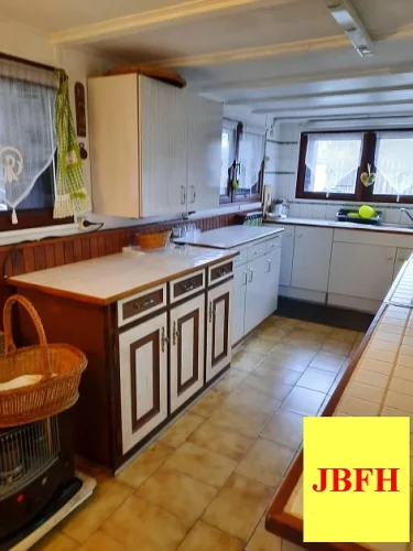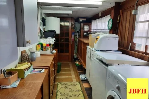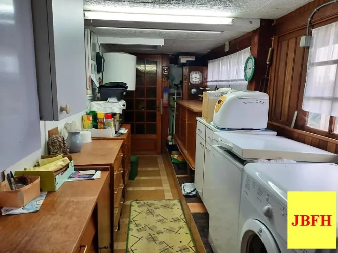 Ground floor : entrance(2.6 sqm), kitchen(12.3 sqm) with tiled flooring, living room(32.2 sqm) with a wood burner, a staircase and tiled flooring, utility room(9.5 sqm), cupboard(0.5 sqm), tiled shower room(6.7 sqm) with a sink and a toilet.