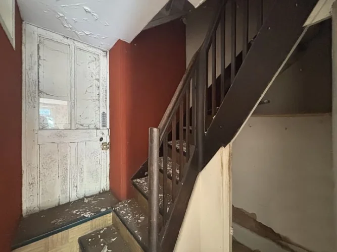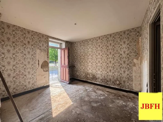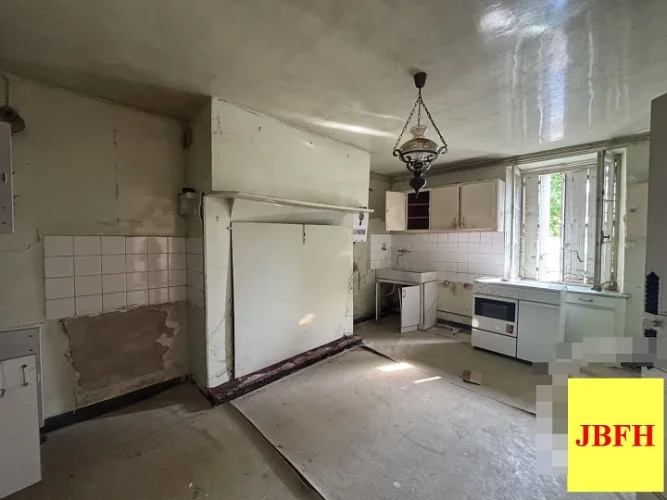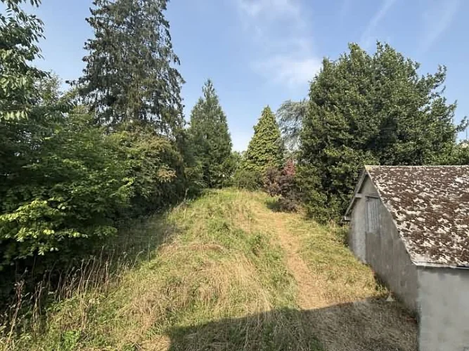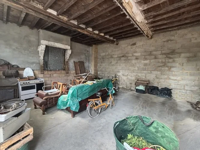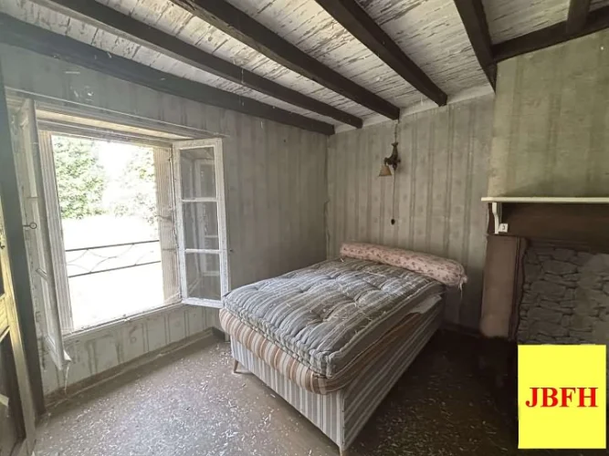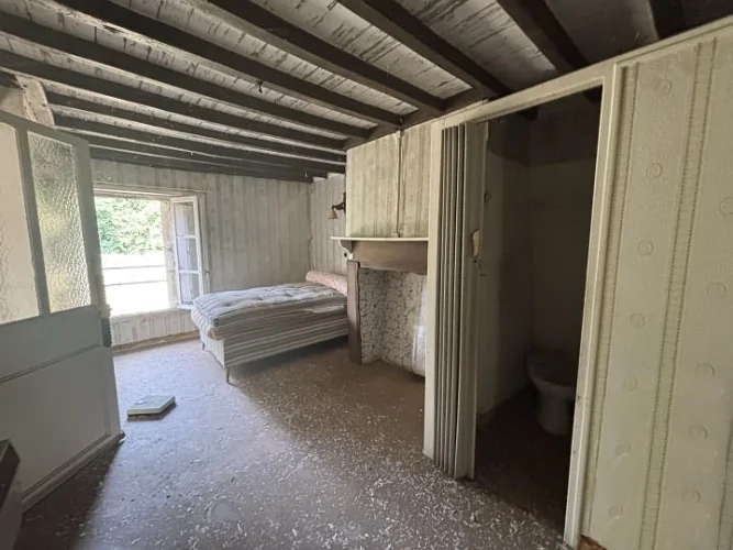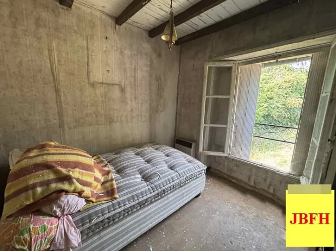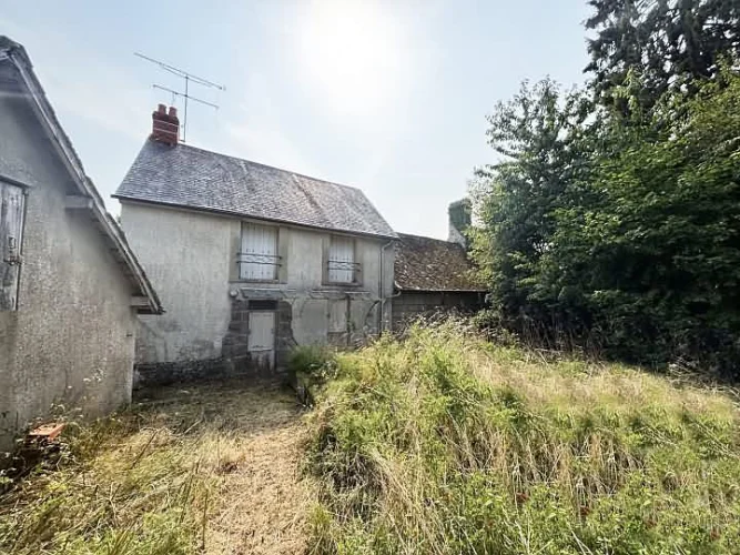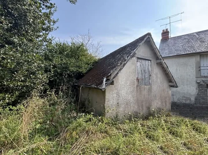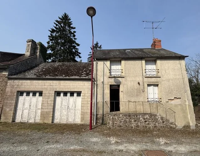 Semi-detached stone and slate property(64.42 sqm), situated in a village not too far from the shops, in the area of Ceauce, with an enclosed garden area of 900 sqm. Heating : wood. Single glazing. Double garage attached. Outbuilding. Tax fonciere : 550 euros per year. Water and electricity but re-wiring and new plumbing needed, roof will need checking, renovation needed for inside.