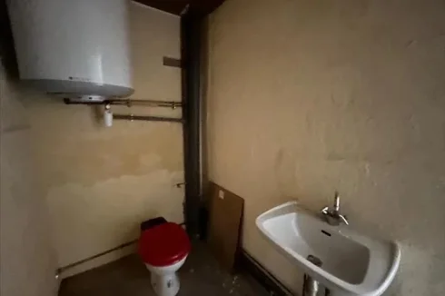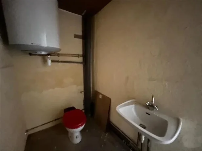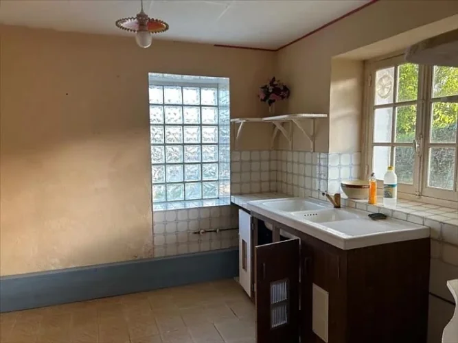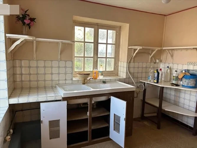 Ground floor : entrance, living room with an ancient stone fireplace and tiled flooring, tiled kitchen with a sink, toilet with a sink.