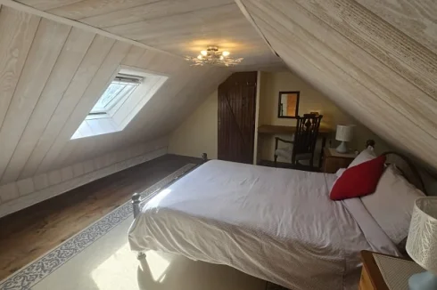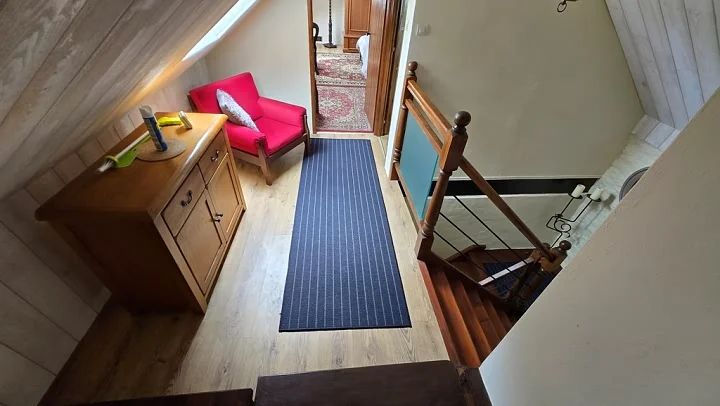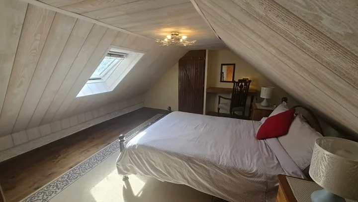 First floor : mezzanine with wood flooring, 2 bedrooms with wood flooring and sloping ceilings, toilet with a washbasin.