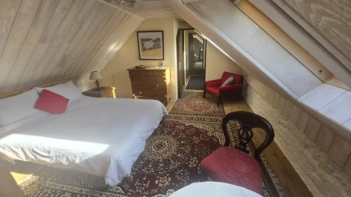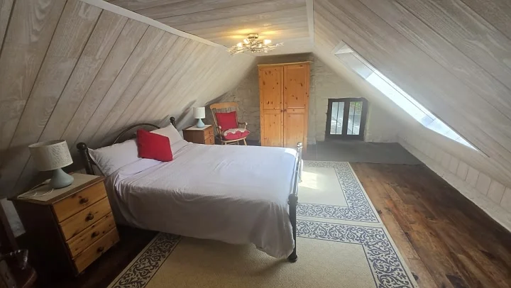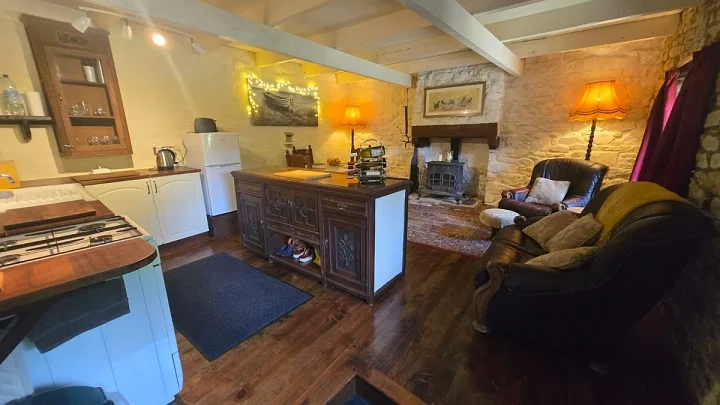 Ground floor : 2 entrances, hallway, bedroom/office, open plan lounge/kitchen with a fireplace and a wood burner, wood flooring and exposed beams, bathroom with a bath, sink, bidet, toilet, utility area in the bathroom, storage cupboard under the stairs.
