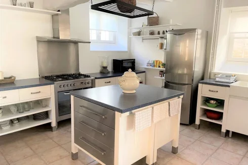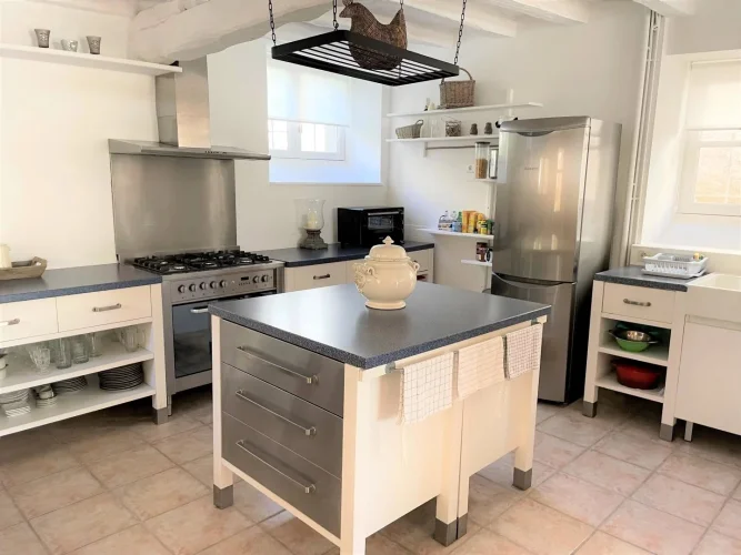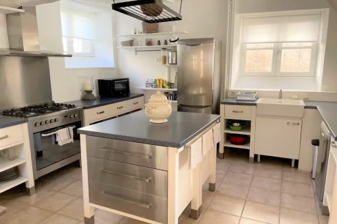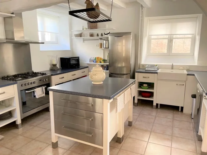 The ground floor comprises an entrance hall, a hallway with staircase and separate WC, a door opening onto the garden, a utility room with sink, a storage room, a lounge/dining room with fireplace and wood burner, a large kitchen with access to the garden.