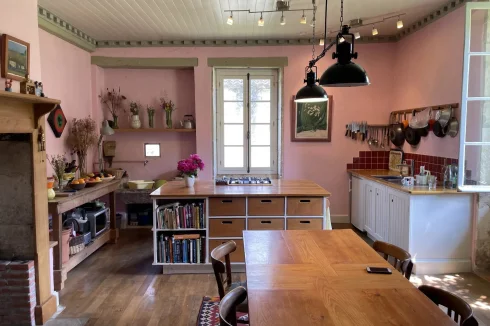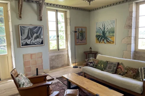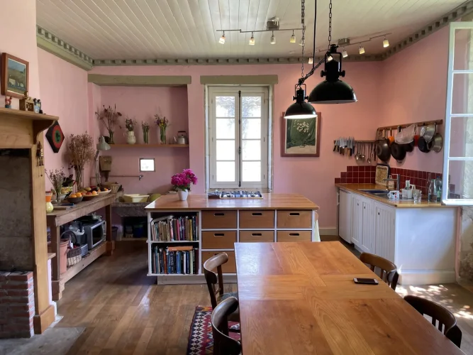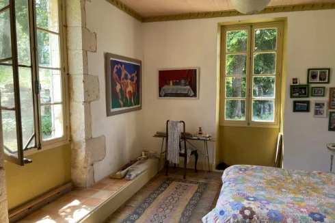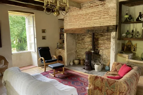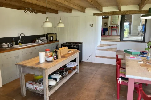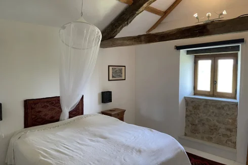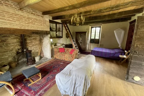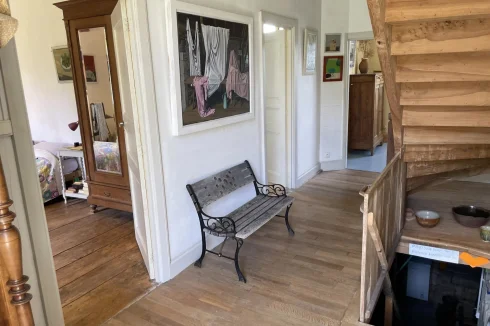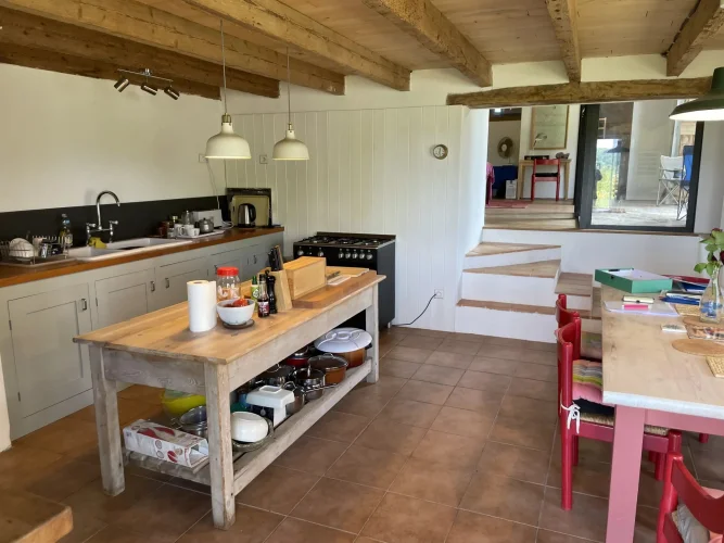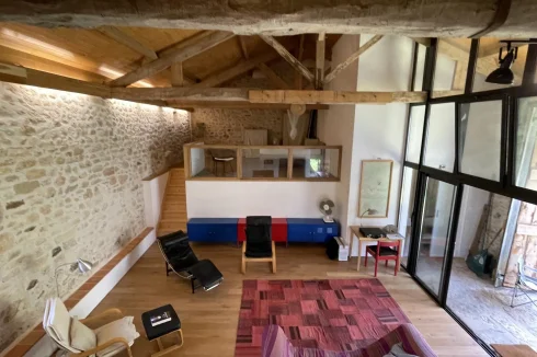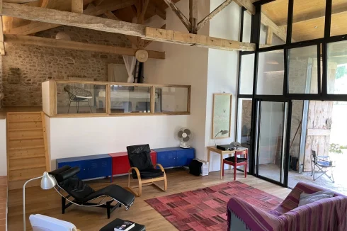 House 2 - Barn converted into a house in 2008. SH of 128 m² + workshopGround floor:Large Living room (42 m²) with wood-burning stove and cathedral ceiling and glazed doors giving access to covered terrace and courtyard. Ceiling and underfloor insulation. Kitchen/dining room (24.25 m²) (underfloor heating in place but energy source needs to be added). Door to garden. Bathroom/WC with shower and bath (6 m²), Utility room (4.5 m²). Workshop (16 m²) and cellar/storage room.First floor: Landing leading to : Bedroom (14 m²) and Bedroom (14.8 m²) with exposed beams and parquet flooring.Another staircase from the living room leads to a study/bedroom (22.36 m²). Heating: wood-burning stove.