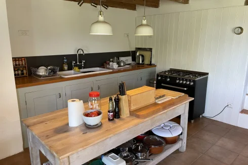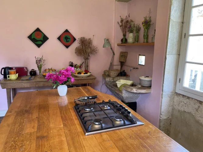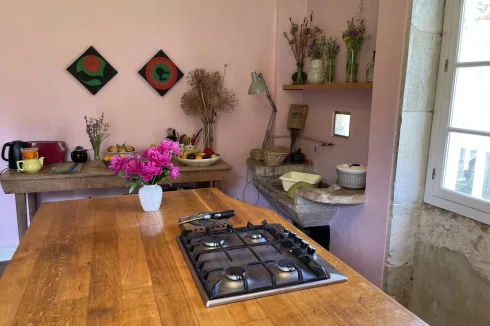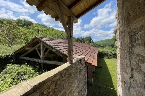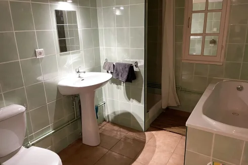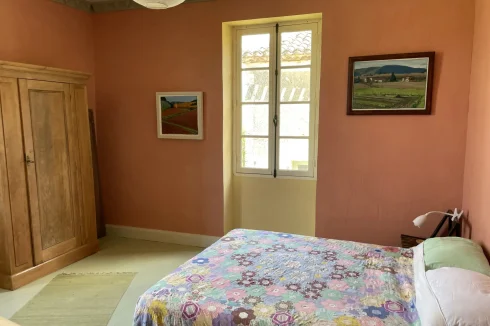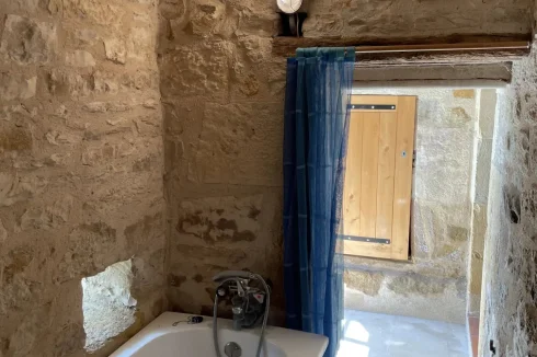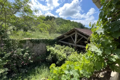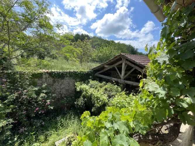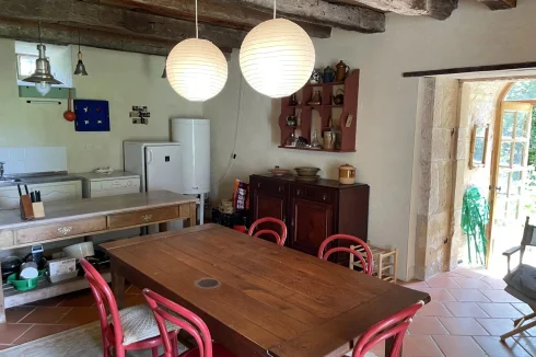 House 3 in stone. SH of 71.25 m².Ground floor: Kitchen/dining room (29 m²) with tiled floor and exposed beams.Hall (3 m²) with patio door to garden. Bathroom/WC (4.3 m²) with stone vaulted ceiling. Small vaulted wine cellar.Outside staircase leads to covered terrace and shower room/WC (2.15 m²).Bedroom/lounge (32.8 m²) with fireplace and wood-burning stove and stone sink. Oak parquet flooring.Enclosed garden. Heating: wood-burning stove