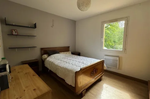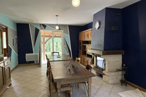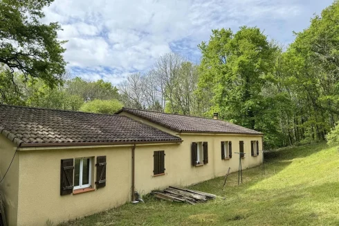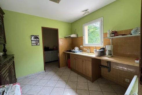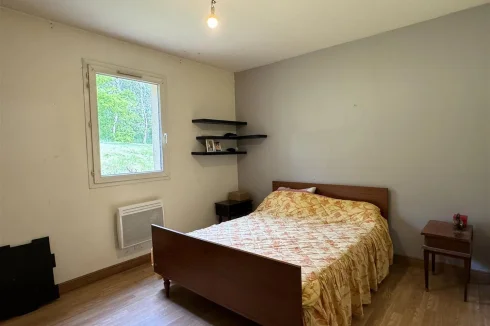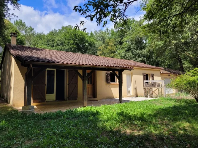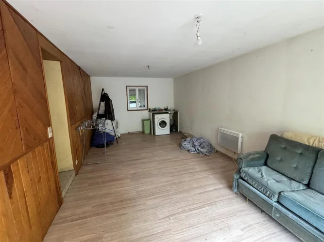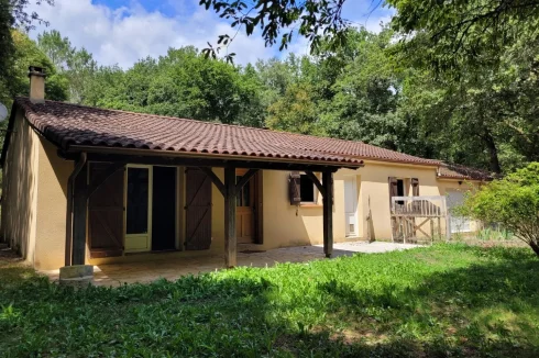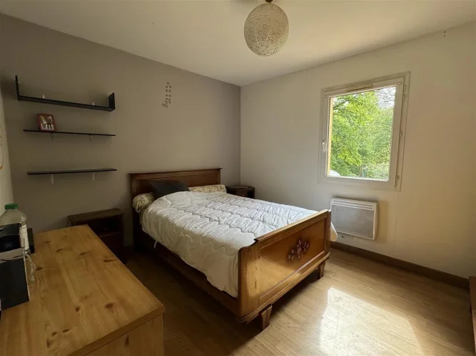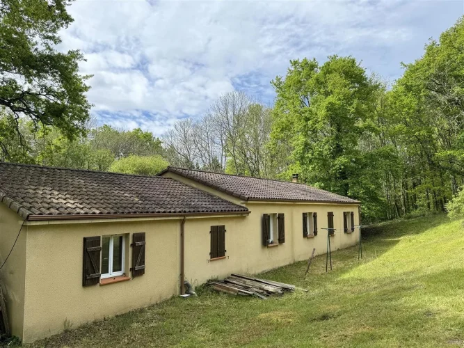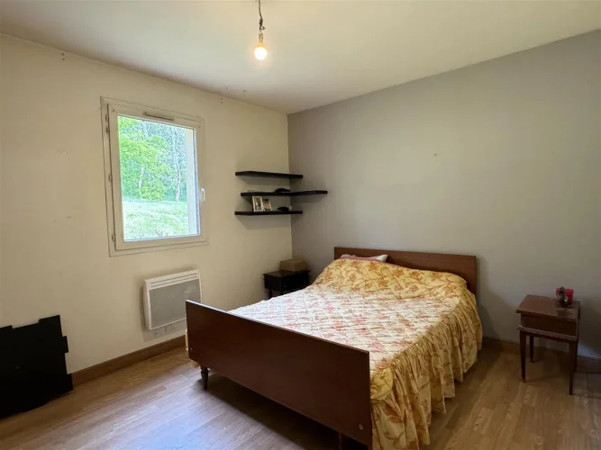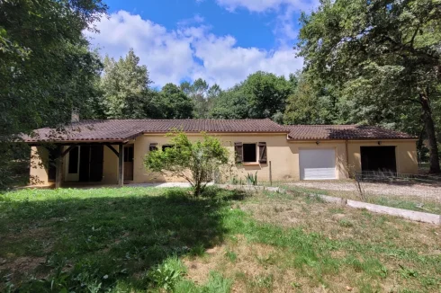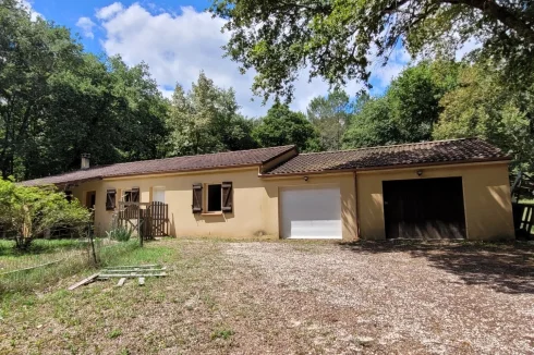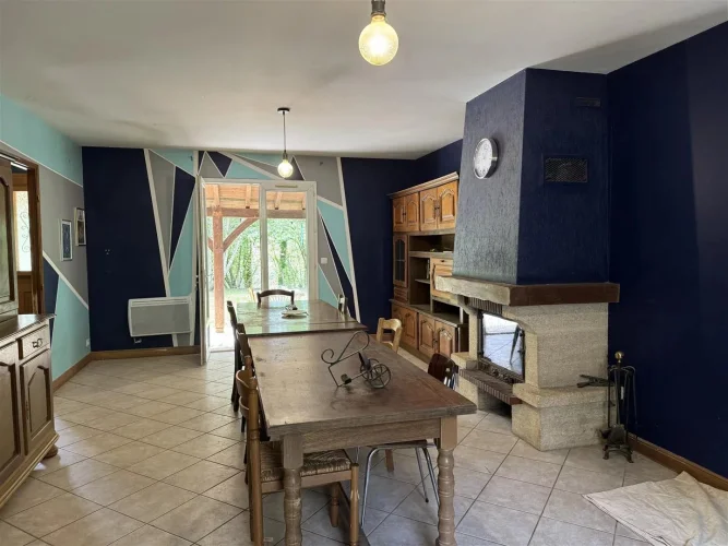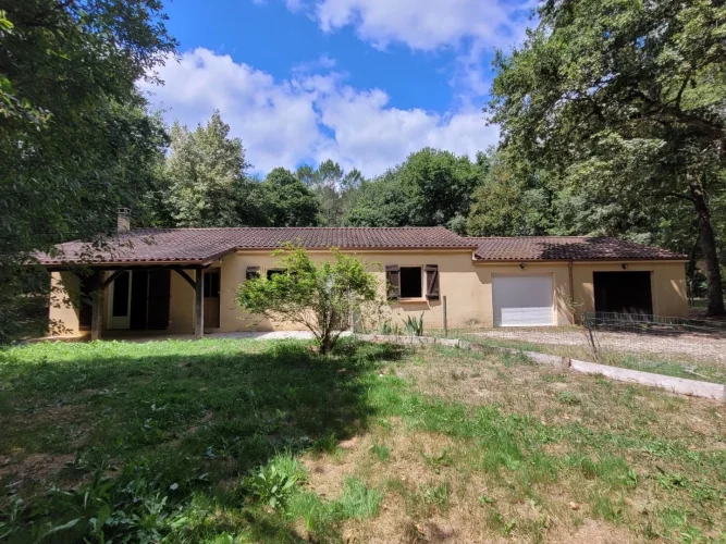 Family home with attached garage, covered terrace and pretty garden with trees of more than 4900 m2, a stone's throw from all amenities. This house, entirely on one level, includes a spacious living room with fireplace/insert, a separate kitchen, laundry room, four bedrooms, bathroom, toilet and large garage. This house is very close to shops on foot, while being located in a peaceful and wooded area.