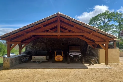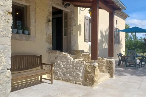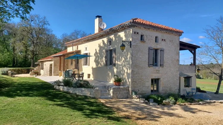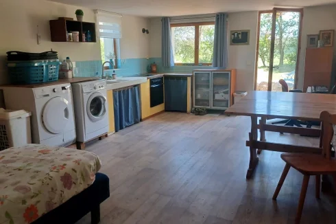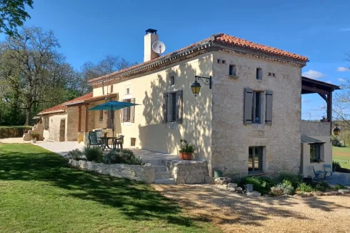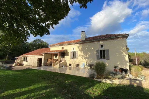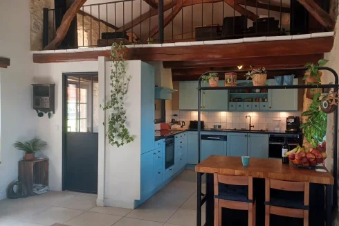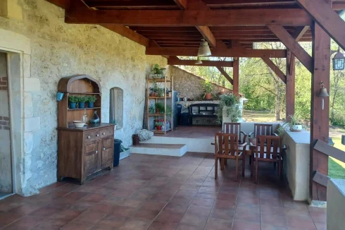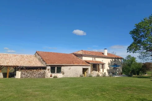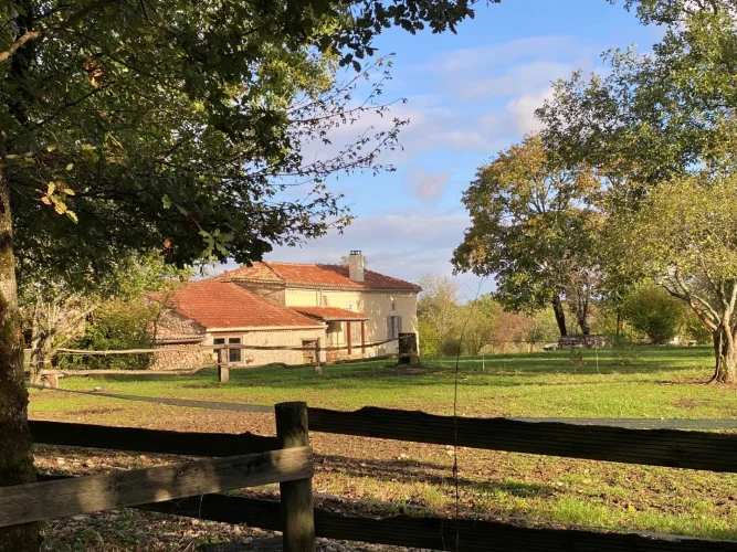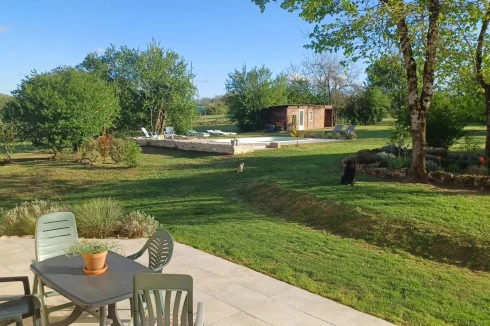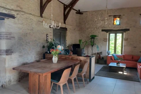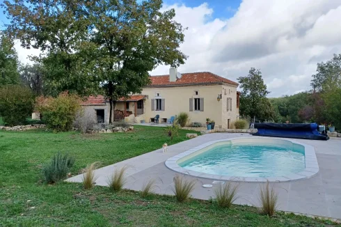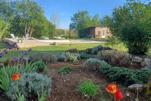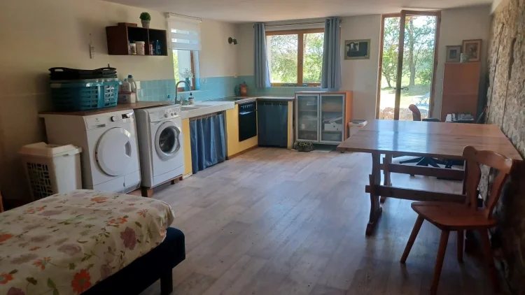 Located in a peaceful environment, completely renovated property, swimming pool and stone barn, all on magnificent grounds of approximately 8 hectares, offering unobstructed views of the surrounding countryside. A stone staircase leads to a large covered terrace. The house is composed of a large bright living/dining room with insert fireplace, and fully equipped open kitchen. A mezzanine converted into an office overlooks this beautiful living space. On the garden level there are 3 spacious bedrooms, a bathroom with shower and bathtub, as well as a large studio with kitchenette and direct access to the outside. Underfloor heating, exposed stones and beams, and lots of charm for this house. Barn adjoining the house, with a floor area of 86 m² with mezzanine, offering large storage capacity or the possibility of conversion into a gîte. As an extension of the barn, an awning of approximately 45 m² allows parking for 2 vehicles. Outside, several terraces, including one covered, allow you to enjoy the peace and the view. Heated swimming pool with beach, all on 8 hectares of land. Part of this land (approximately 1.7 ha) offers the possibility of creating a tourist accommodation area, such as the installation of tent-chalets, etc.,... Very good potential for this property, just 1 km from local shops. It has countryside views.