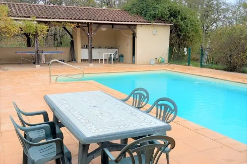 Charming property with swimming pool on a plot of more than 4.5 ha, 5 minutes from a village with all shops and 25 minutes from Cahors. This family home with a living area of approximately 204 m², includes a large entrance hall leading to a fitted kitchen, dining room, spacious living room with beautiful ornemental stone fireplace and wood stove, double French windows opening onto a large south-facing terrace, large office with direct access to the garden and second living room/library, separate toilet and a master suite with shower room. An oak staircase leads to 4 bedrooms, including a second master suite with bathroom, a family bathroom and separate toilet, numerous cupboards and storage spaces. Full basement with crawl space, garage and laundry area, wine cellar and technical room housing the heat pump and water softener. This spacious, comfortable and bright property is located in a peaceful countryside setting, on a plot of over 4.5 ha, with a paved path leading to a 10x5m fenced swimming pool, a summer kitchen with covered terrace and a pumping station for the pool. Independent garage. Ideal house for a quick move, to visit without delay!