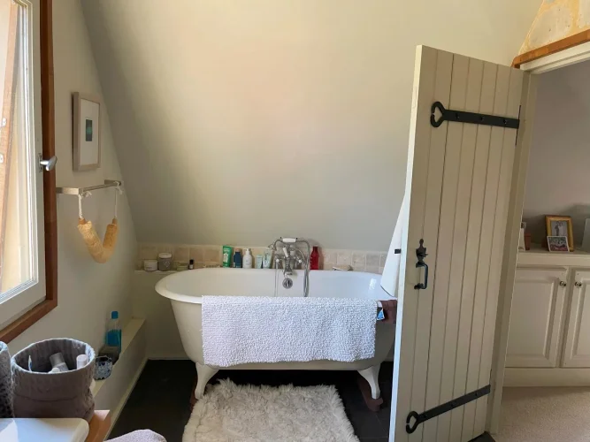 Many original features such as a fireplace, old sink, vaulted ceilings, beams, exposed stone walls, bricks, give great charm to this house.
