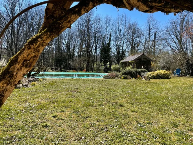 Attached garage and garden shed. Paved terraces and a 14x7 m swimming pool with a counter-current system. Magnificent 6845 m² plot of land with trees and flowers, offering a beautiful green setting for this comfortable family home. Quiet environment, 5 minutes from Gourdon and all its shops.