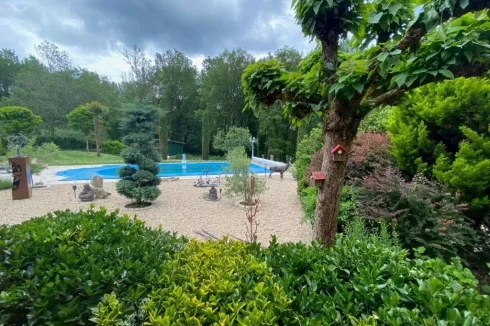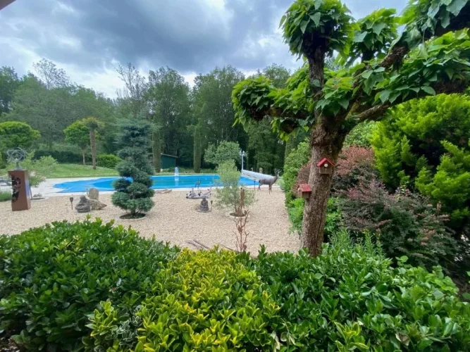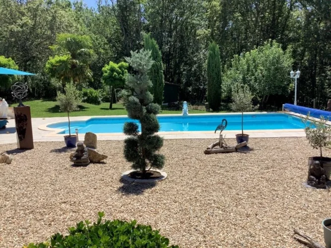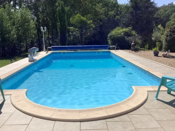 A beautiful chloring swimming pool 5 m x 10 m with roman stairs, liner, and cobbled beaches of 120 m². Secure electric pool cover. A shelter. A double garage of 70 m².