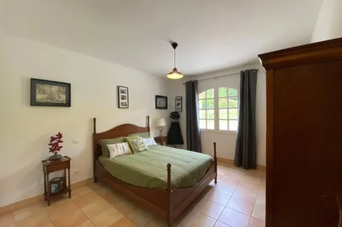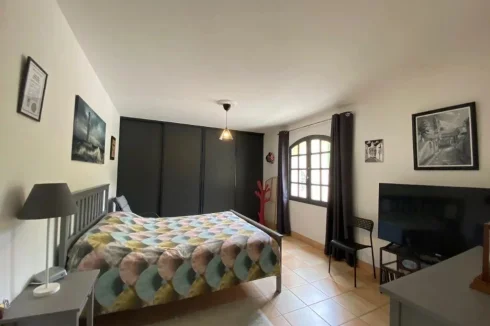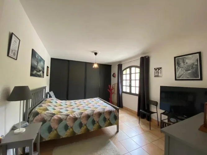 A bedroom of 15.50m² with storage sliding cupboards, window, tiled floor.