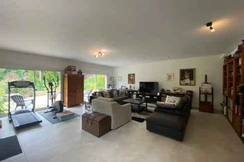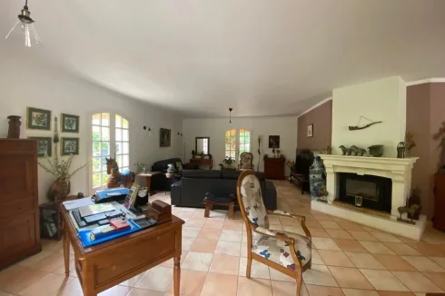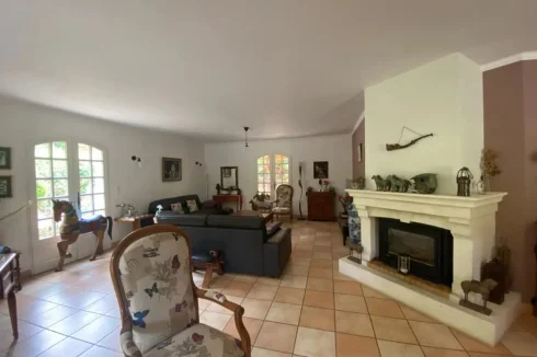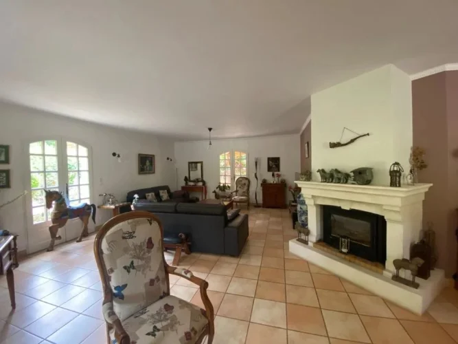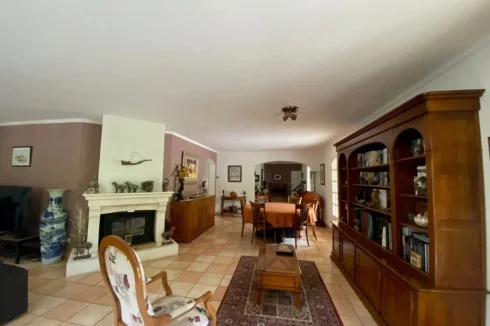 A large L shaped living room and lounge in 58,50m² with fireplace and wood burner, tiled floors, 4 door windows opening onto spacious tiled terraces and veranda built in 2012.