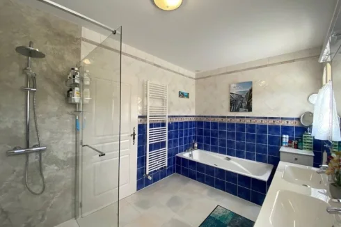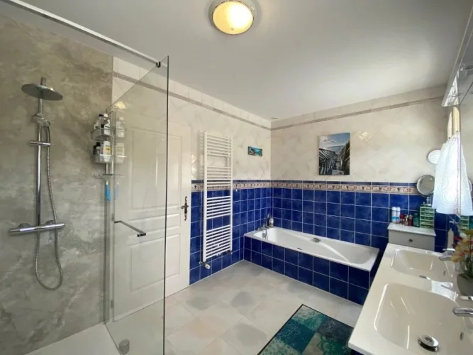 A bathroom of 9.30m², bath, Italian shower, 2 basins on furniture.