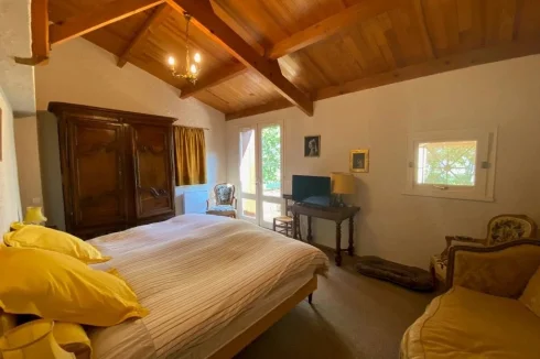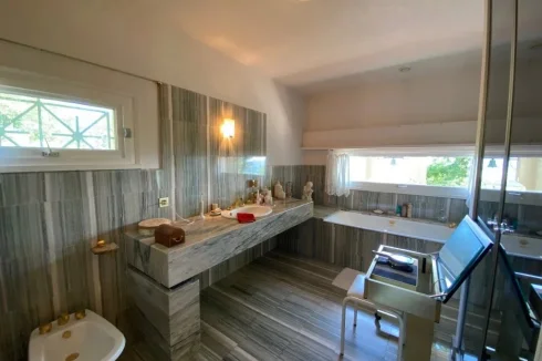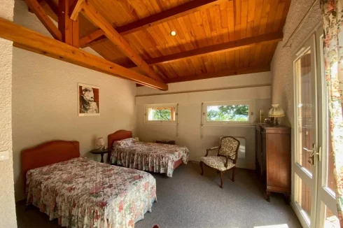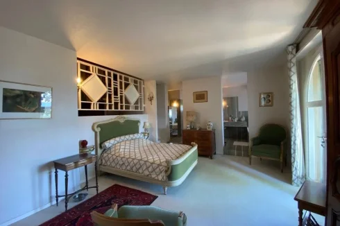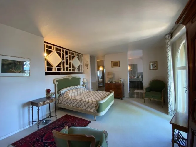 A 24 m² bedroom, built-in cupboards, bay window opening on to a terrace and swimming pool with ensuite 12.5 m² bathroom, bath, Italian shower, washbasin, bidet, separate WC, built-in cupboard, marble floor.